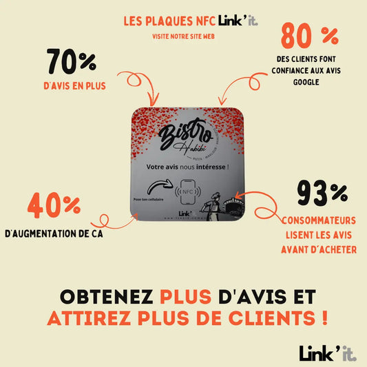 Il suffit d'approcher la plaque avec un smartphone pour ouvrir un lien redirigeant l'utilisateur vers la destination de son choix (Avis Google, Instagram, Facebook, etc.).