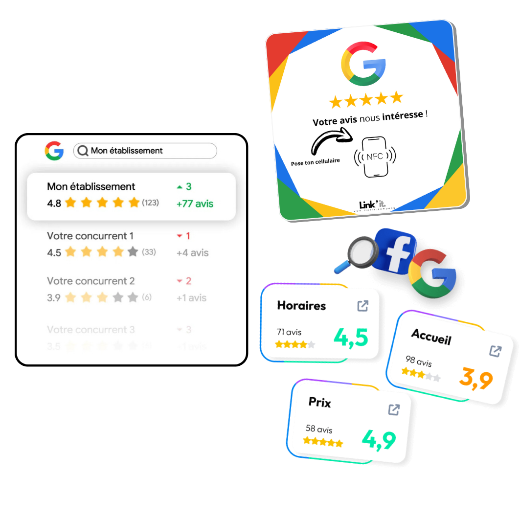 Simply approach the plate with a smartphone to open a link redirecting the user to the destination of their choice (Google Reviews, Instagram, Facebook, etc.).
